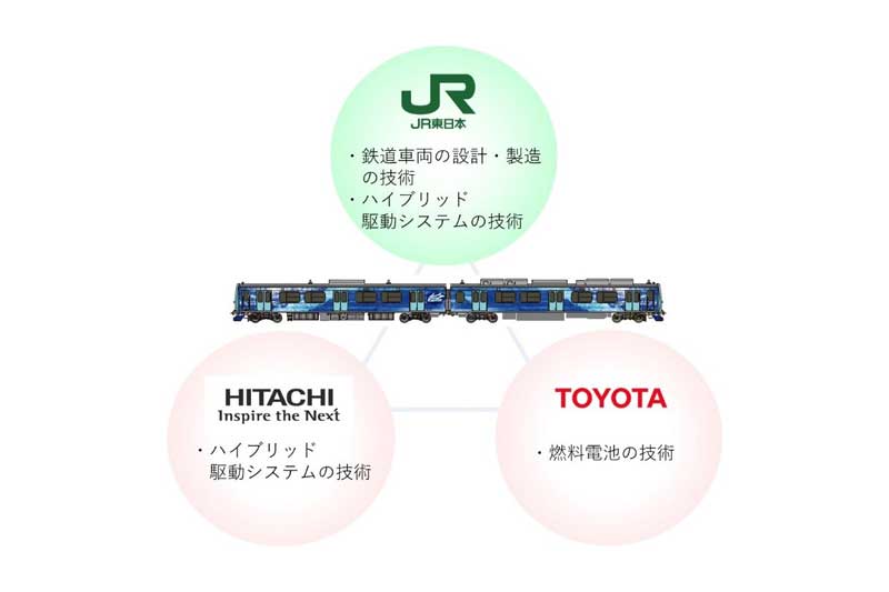 各社の役割は、燃料電池技術をトヨタが、燃料電池と主回路蓄電池とのハイブリッド駆動システム技術を日立が、「NEトレイン」などで蓄積してきた燃料電池車両の設計・製造技術をJR東日本がそれぞれ提供する予定。