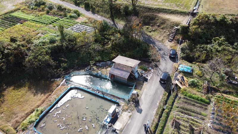 ナノ水力発電が設置された養鯉場の全景。常に水が流れ込んでいるため、今回の実証実験に適した場所といえる