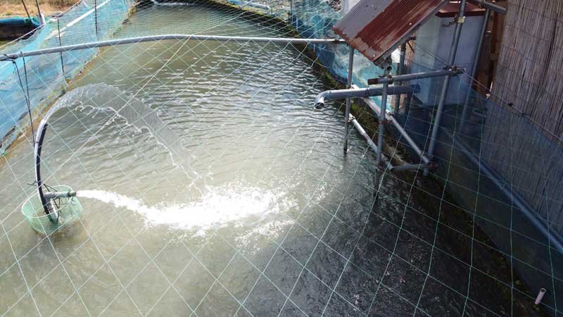 養鯉場の水中ポンプや自動給餌機。ナノ水力発電を活用すれば停電の影響を受けないため、魚たちの大切な命を守ることができる