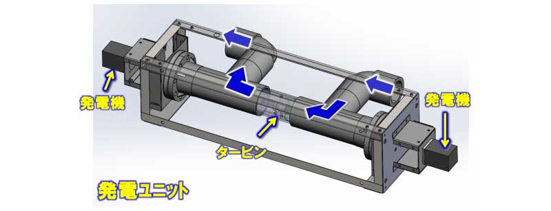 発電の仕組みはシンプルで、直径125mmのパイプから取水し、直径100mmのデュアルタービンを水流で回転させるというもの。機器の両端につけられた発電機で電力をつくる。
