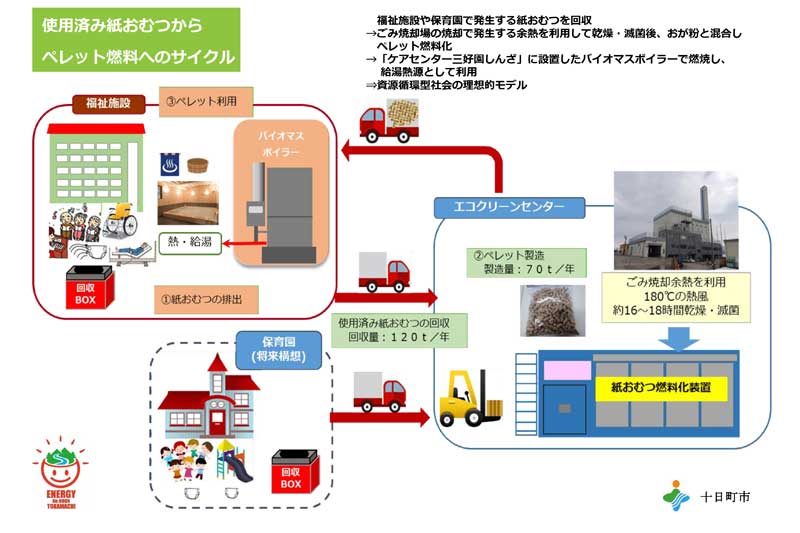 同市では2014年度から使用済み紙おむつの有効活用を検討しており、地元の社会福祉法人 十日町福祉会と事業契約を締結。JFEエンジニアリング株式会社の施工によって、ペレットの製造からボイラーでの燃焼まで一連のシステムを作り上げた。