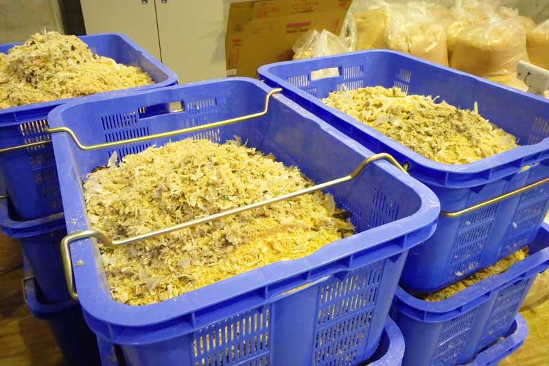 その後、粉砕機によってさらに細かく砕かれ、粒造機によって大きめのドッグフードに似た形状のペレットが作られる仕組み。