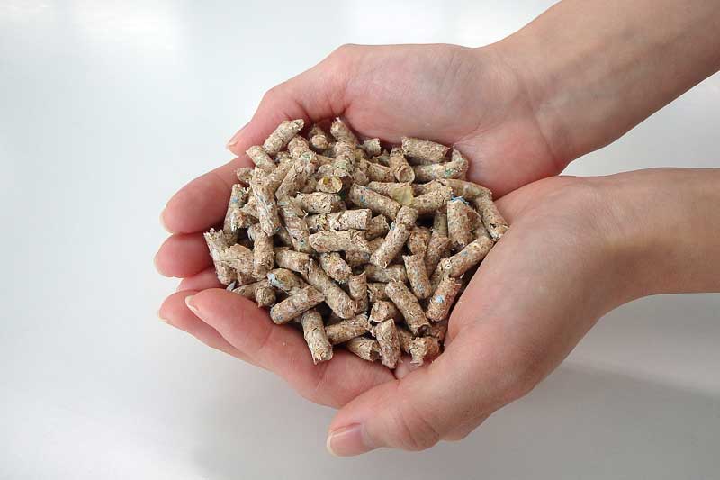 紙おむつとおがくずを原料に作られたペレット。臭いも気にならず、衛生面も問題ない