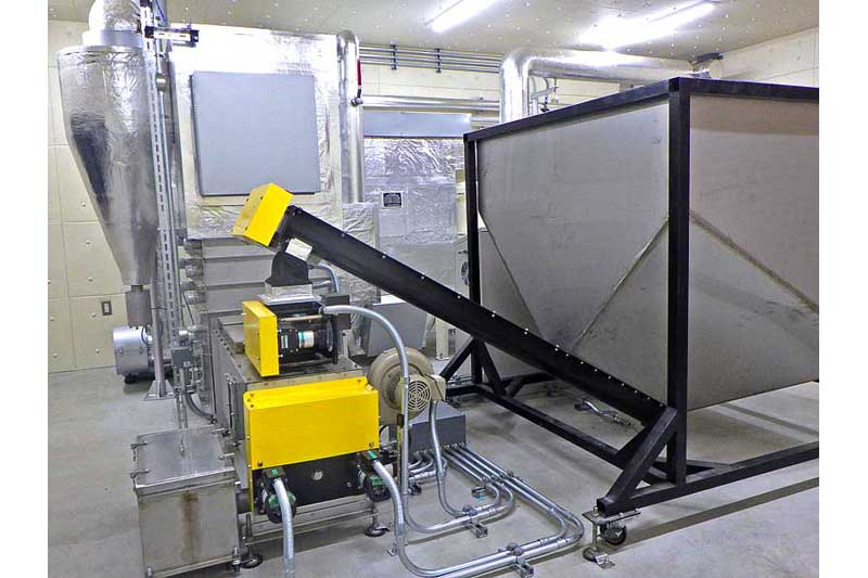 「十日町市エコクリーンセンター」に設置された紙おむつ燃料化装置。写真右側に見えるパイプから温風が送られてくる