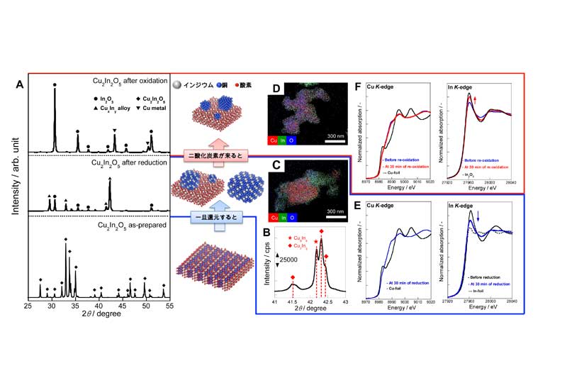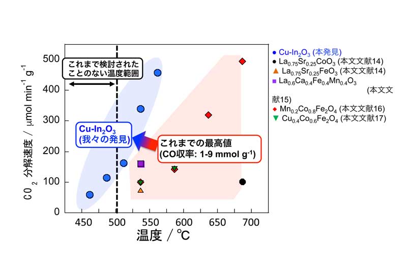 そこで、研究グループは固形の酸化物の酸化と還元の組み合わせに着目し、数百以上に及ぶ候補材料を検討。その結果、液晶ディスプレイや薄膜太陽光発電などの電子デバイスに用いられるインジウムと銅を組み合わせた合金酸化物「Cu-In2O3」が低温でも高い反応率に期待できることを見いだした。