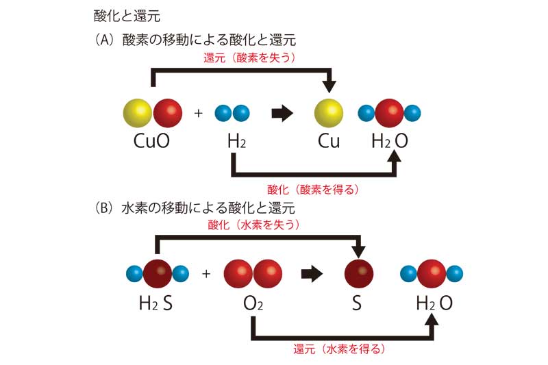 酸化と還元の化学反応を示した図。酸素と水素では考え方が異なり、酸素の場合は、酸素と化合する反応を酸化、酸素を失う反応が還元となる、それに対し、水素の場合は、水素を失う反応を酸化、水素と化合する反応が還元となる