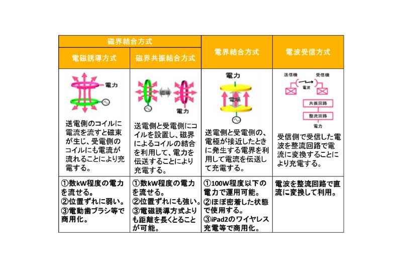 EV(電気自動車)など大容量の給電に適したものでいえば、磁界を用いる磁界結合方式と電界を用いる電界結合方式の2種類。磁界結合方式はそこから電磁誘導方式と磁界共振(共鳴)結合方式に細分化され、それぞれの特性に合わせた使い方で製品化が進んでいる。