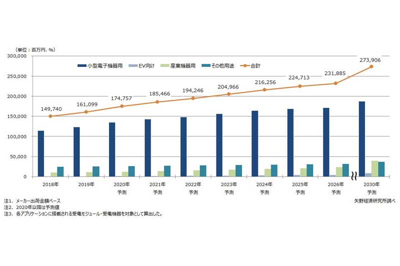 矢野経済研究所が2020年5月に発表した「ワイヤレス給電世界市場に関する調査」によると、2030年の市場規模は2019年比で7割増の2739億円に拡大。中でも、小型電子機器や産業機器での伸びが顕著だとしている。