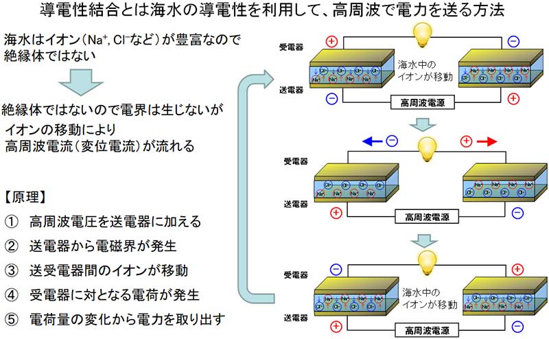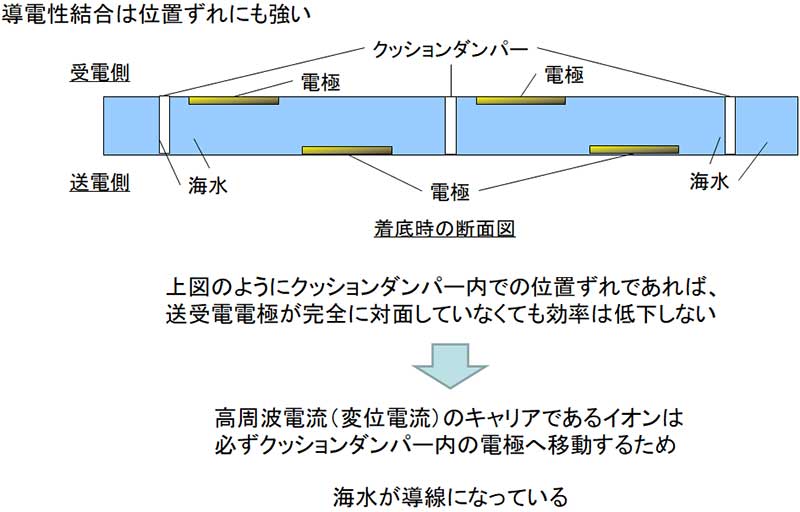その導電性の⾼さゆえ、電界結合⽅式を海中で⾏うと⾼周波の電流が発⽣。陸上や淡⽔中に⽐べて送受電器の損失(Q値)が発生してしまうため、海中での同⽅式の実⽤化は難しいとされている。