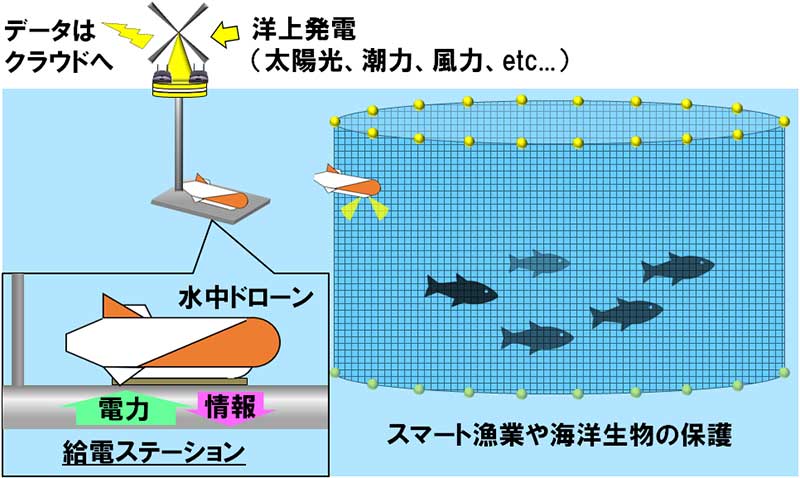 海中ドローン導入のイメージ図。再生可能エネルギーから得た電力を基にワイヤレス給電を行う