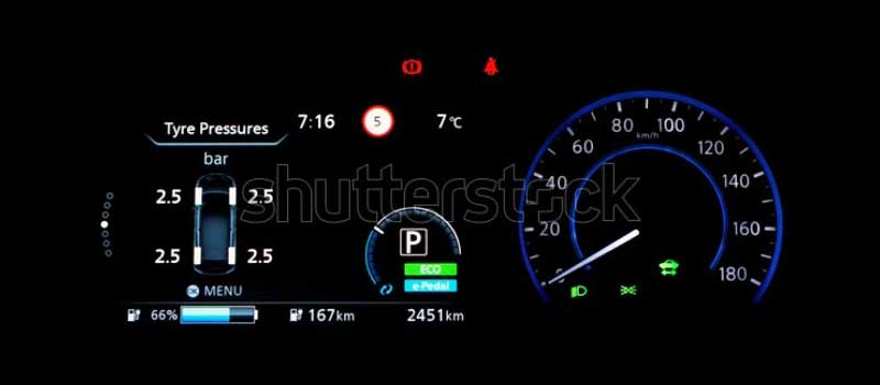 TPMSの使用例。タイヤの情報がダッシュボードパネルの左側に表示されている