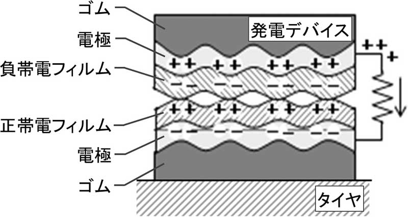 タイヤに起こる変形で、正帯電フィルムと負帯電フィルムに摩擦が発生し静電気が生まれる