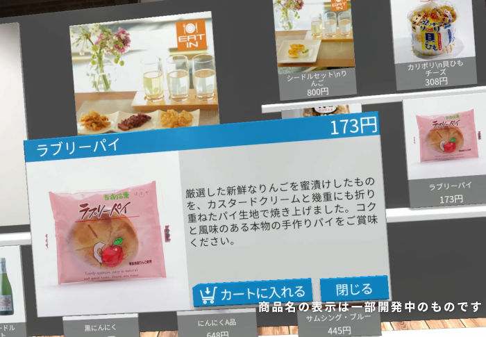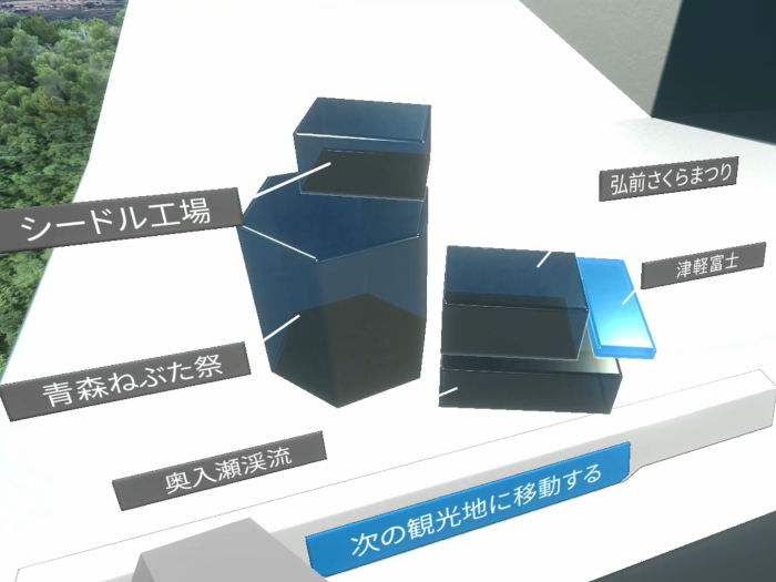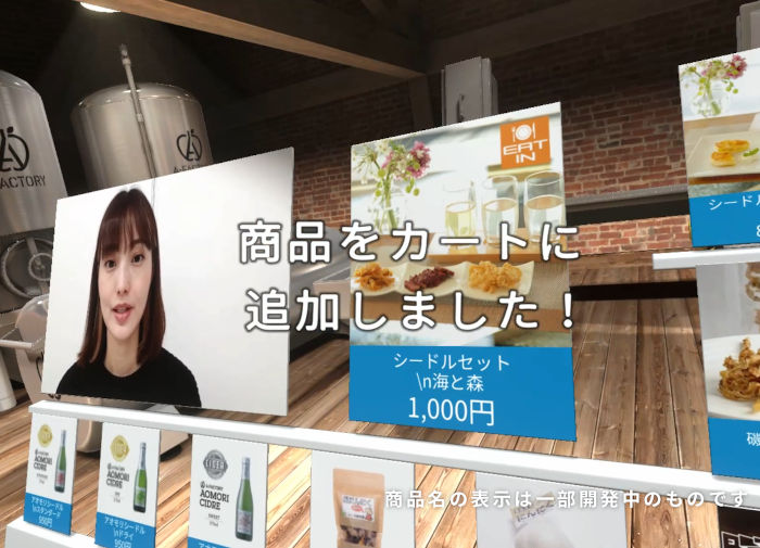 先述のVR空間の各観光スポットには、青森の名産品を紹介する掲示板のようなボードが浮かんでいる。ボードの上に商品画像が並べられており、欲しいものに触れると購入することもできるという。