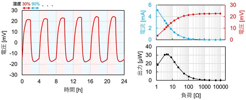 湿度を変化させたときの湿度変動電池の電圧(左)と負荷を接続した際の出力(右)