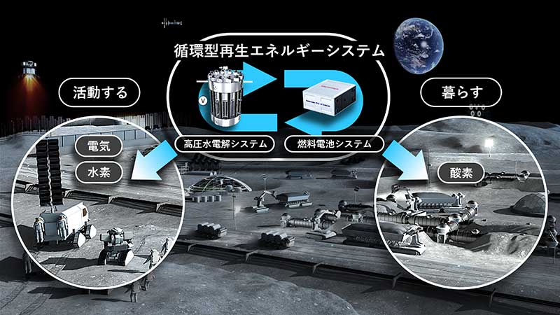 具体的には、太陽エネルギーを使って、高圧水電解システムで水を電気分解し、酸素と水素を製造。酸素は有人拠点で活動する人の呼吸用として、水素は月面を離発着する輸送機の燃料としての活用を見据える。また、酸素と水素を使って燃料電池システムで発電し、有人拠点や移動用車両などへの電力供給も想定されている。