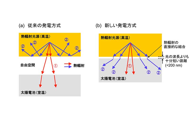 従来の発電方式は、自由空間の屈折率が光源や太陽電池の屈折率よりも小さく、光源の内部で発生した熱輻射のほんの一部しか外部に取り出せず、大部分は光源内部にとどまってしまう。