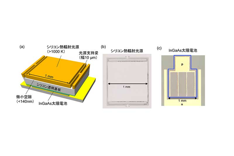 実際に作成された熱光発電デバイスは、熱輻射光源─太陽電池間が光の波長よりも小さい微小な空隙(140nm)しかなく、ほぼ一体化。加えて、シリコンの透明(高屈折率)基板にはInGaAs材料(ヒ化インジウムガリウム/半導体素子の材料として多用されている)を用いて開発した太陽電池(c)を組み合わせ、透明基板側に引き出された熱輻射を太陽電池に直接伝搬できるようにした。