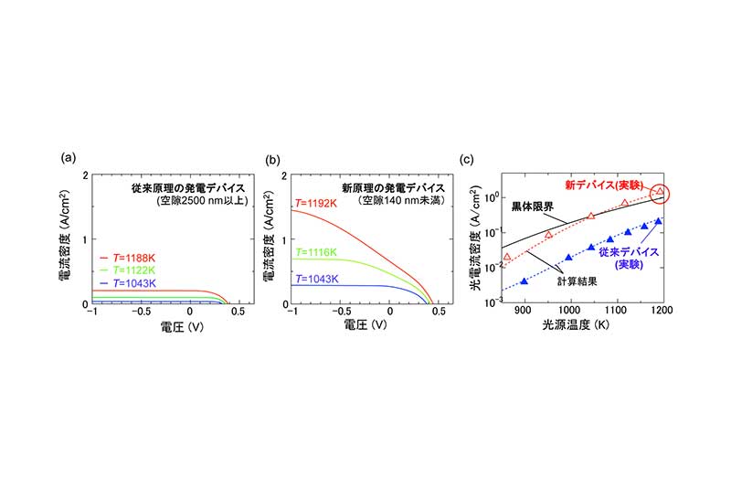 従来原理の発電デバイスによる電流電圧特性の測定結果(a)、新しい原理の発電デバイスの電流電圧特性の測定結果(b)、新デバイスおよび従来デバイスで得られた光電流密度の比較(c)