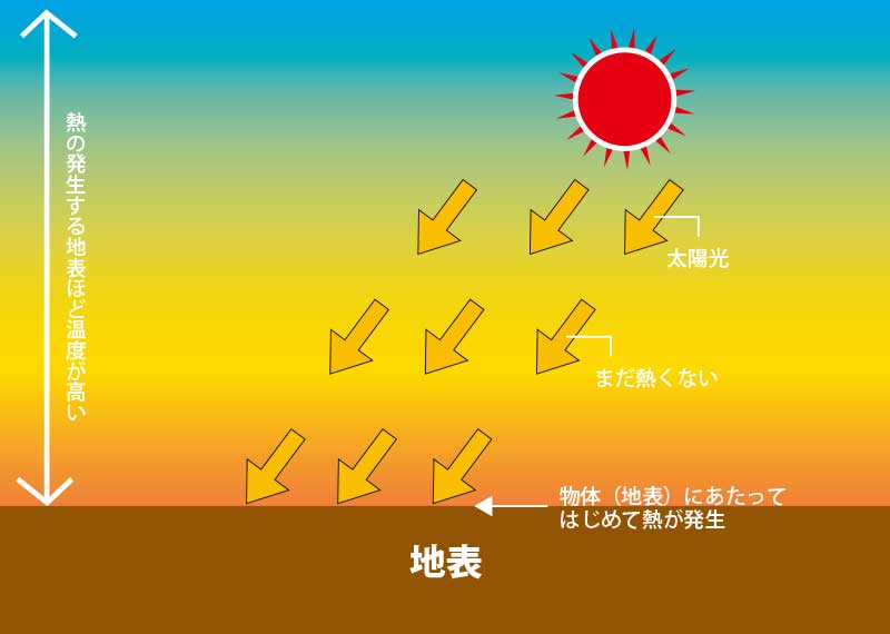 太陽光が熱輻射で地表を温めるイメージ図。光が物質に当たることで初めて熱を発生させるのが特徴だ