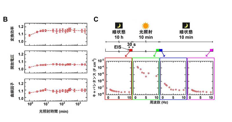 炭素電極を備えたペロブスカイト太陽電池に疑似太陽光を照射した際の発電出力特性の変化(光照射前の初期値を1として規格化)を示す図(B)と、電気化学インピーダンス分光によるイオンが関連する低周波数領域におけるキャパシタンスの光照射中および光照射前後の変化図(C)
