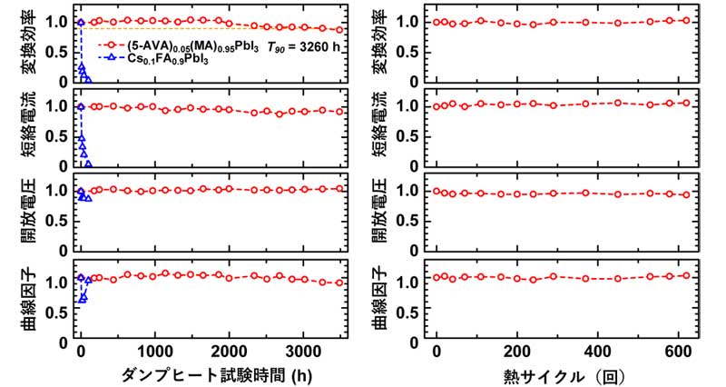 炭素電極を備えたペロブスカイト太陽電池における耐候性加速試験の結果。左図が85℃/85%相対湿度環境下でのダンプヒート試験、右図は-40~85℃での熱サイクル試験の結果を示している