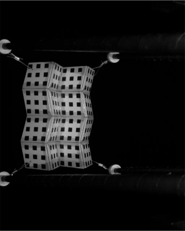 今回の実証では、折り紙工学(※)における「ミウラ折り」を発展させ、面積と厚みのある二次元展開板構造物(以下、パネル)を折り畳んで「ひろがり」に収納した。併せて、二次元格子を利用した光学的な表面形状計測システムを搭載し、宇宙へと放っている。