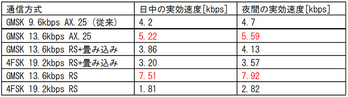 その上で、通信条件を昼夜および仰角の高低で 4 通りに分類し、「単位時間当たりにどれだけの量のミッションデータをダウンリンク(地上へのデータ伝送)することができるか」を示す実効速度を算出したところ、今回の「ひろがり」の通信技術では比較的不利な低仰角の場合であっても、特定の通信条件(GMSK 13.6kbps AX.25とGMSK 13.6kbps RS)で従来方式の実効速度を上回ることに成功した(通常、高仰角であれば人工衛星と地上局との距離が近くなるため、通信条件としては有利になる)。