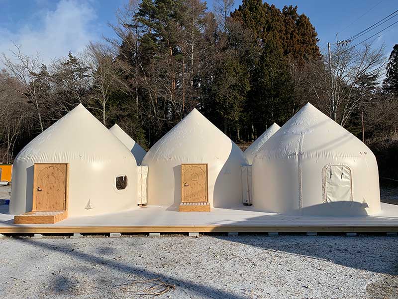 今回使用されるインスタントハウスは、ドーム形の生地を空気によって膨らませた後、内側からウレタン材を吹き付けると、生地とウレタン材が一体になった建築物が出来上がる手軽さがウリ。
