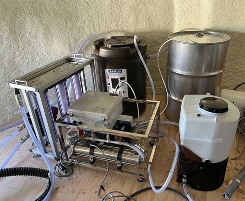 インフラ棟に配されるワイズグローバルビジョン社の小型淡水化装置「MYZシリーズ」。脱塩、塩分除去により海水から真水を作れるほか、濁水などもろ過して厚生労働省が定める水道法の基準値をクリアする真水に変える優れもの