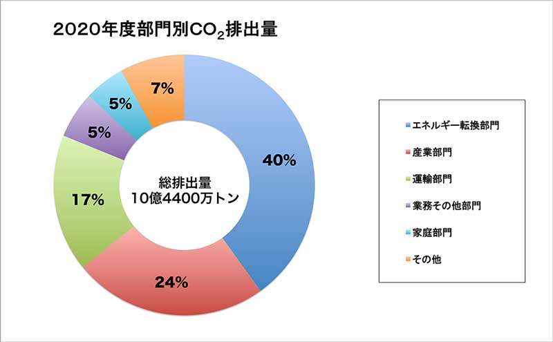 「2020年度(令和2年度)の温室効果ガス排出量(速報値)について」(2021年12月9日環境省発表)によれば、日本のCO2総排出量は10億4400万トン。