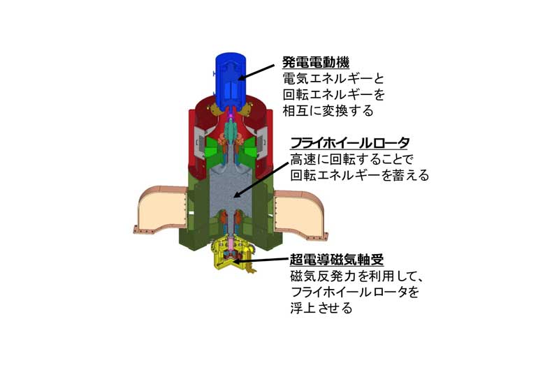 さらに開発されたシステムには、フライホイールローターの荷重を受ける軸受け部分に超電導技術(超電導磁気軸受)を採用。