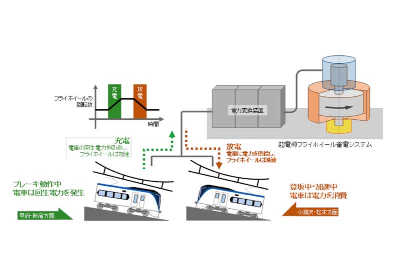 具体的には、穴山駅付近の下り勾配を走行する列車から回生電力エネルギーを運動エネルギーとして貯蔵し、上り勾配を登坂走行する列車にエネルギーを放出。
