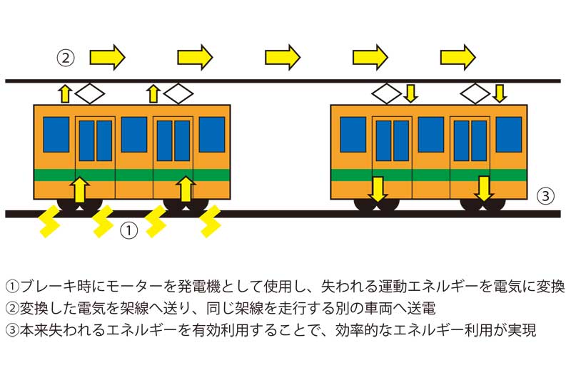 回生ブレーキとは、電車がブレーキをかけた際に失われる運動エネルギーでモーターを発電機として作動させ、電力に変換。架線を介して他の電車に供給することで、効率的なエネルギー利用が可能になる仕組みだ。