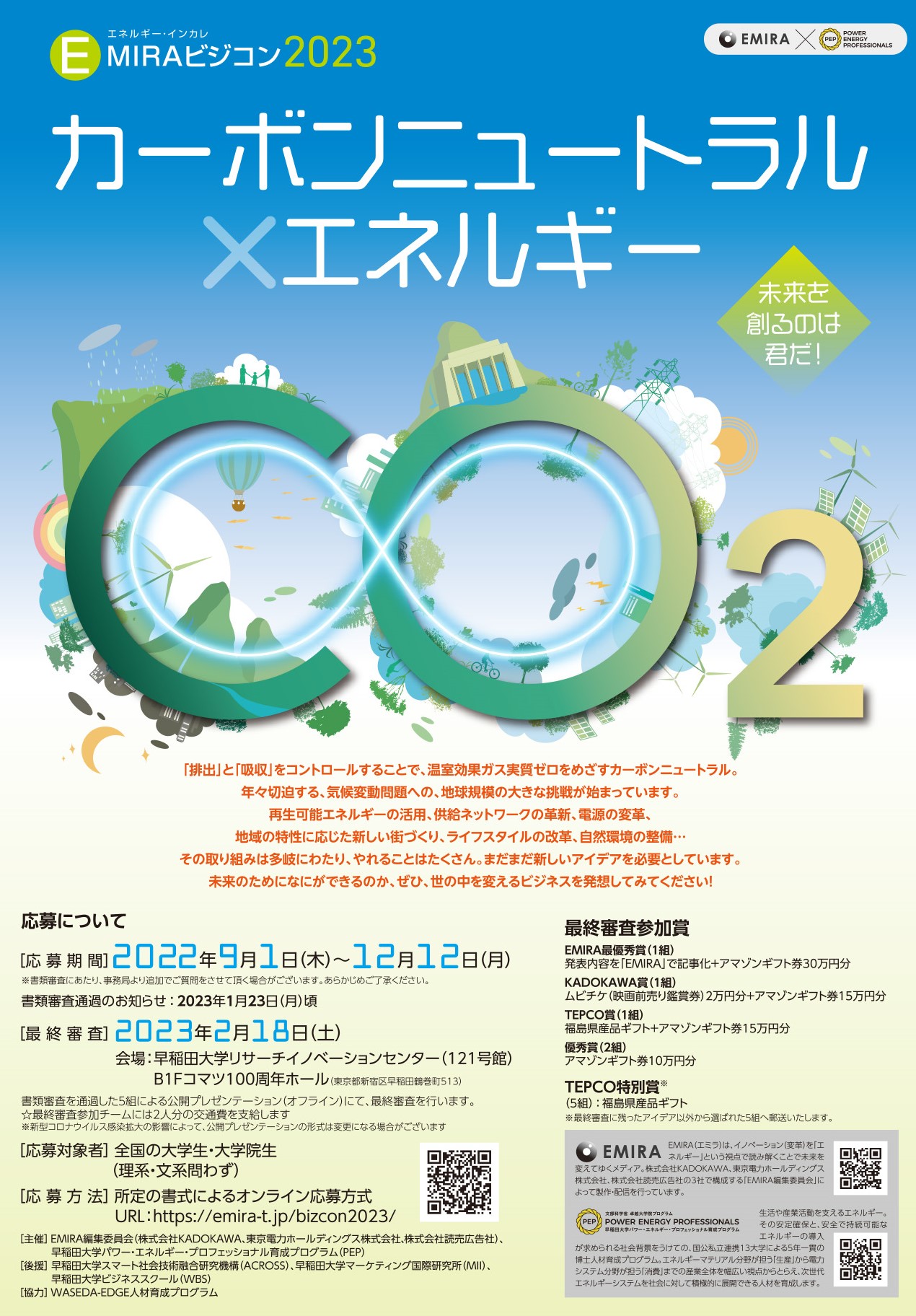 今年度も、「EMIRA」と「早稲田大学パワー・エネルギー・プロフェッショナル育成プログラム(PEP)」がタッグを組んで実施する学生コンテスト「EMIRAビジコン2023 エネルギー・インカレ」の開催が決定! 今回は「カーボンニュートラル×エネルギー」をテーマに、未来をより良くするビジネスアイデアを募ります。