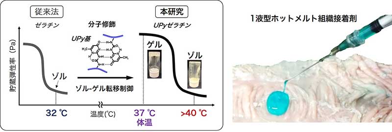 導入するUPy基の数により、ゼラチンのゾル-ゲル転移温度を自在に制御することができ、加温によってゾル化し、体温でゲル化する「ホットメルト」特性を導入した組織接着剤が設計可能になる。