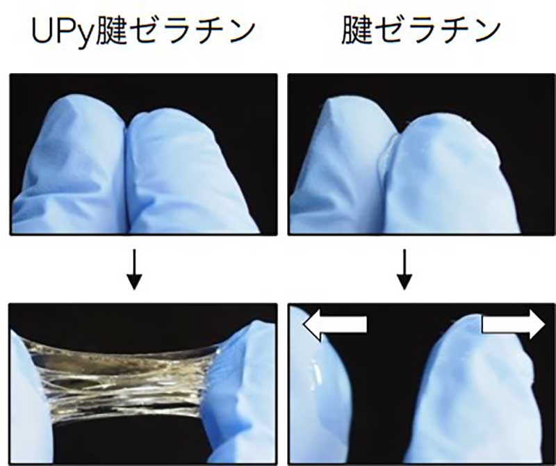 今回の研究ではブタ腱由来ゼラチンに対しUPy基を導入することで、分子間水素結合を人工的に増強した「UPy腱ゼラチン」を合成。
