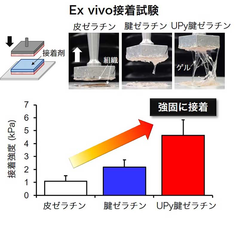 接着の強度エネルギーは皮ゼラチンの4.2倍、腱ゼラチンの2.1倍。また、37℃までゲルの温度を低下させると、他の組織に対する接着性が失われることも確認済みで、癒着防止材料として有用であることも分かったという。