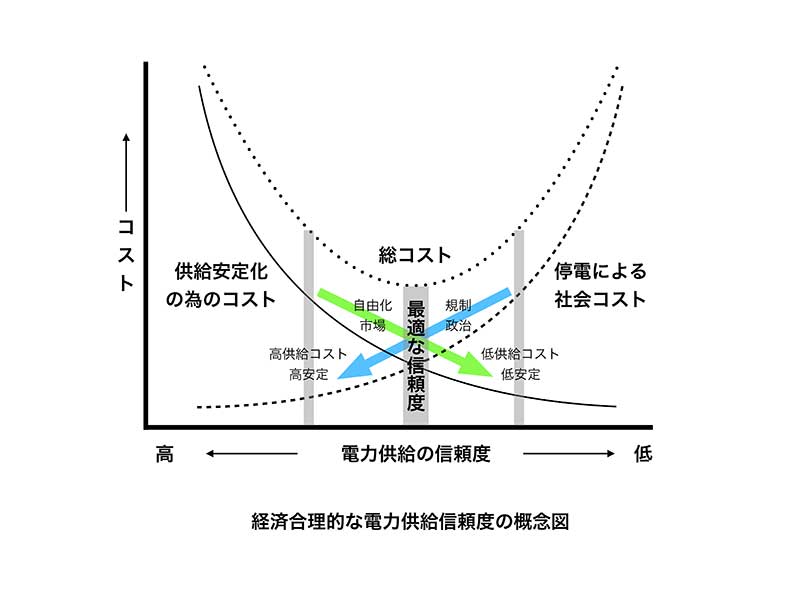 この関係において、電力供給システムを自由化すると供給コストが安い方向に最適化されるので、どうしても信頼度を下げる方向に進んでしまう。そのため、自由化においては政治的に社会コストを下げる方向の容量市場のような制度を導入し、総コストの低い最適信頼度を目指すのが基本的な考え方となる。