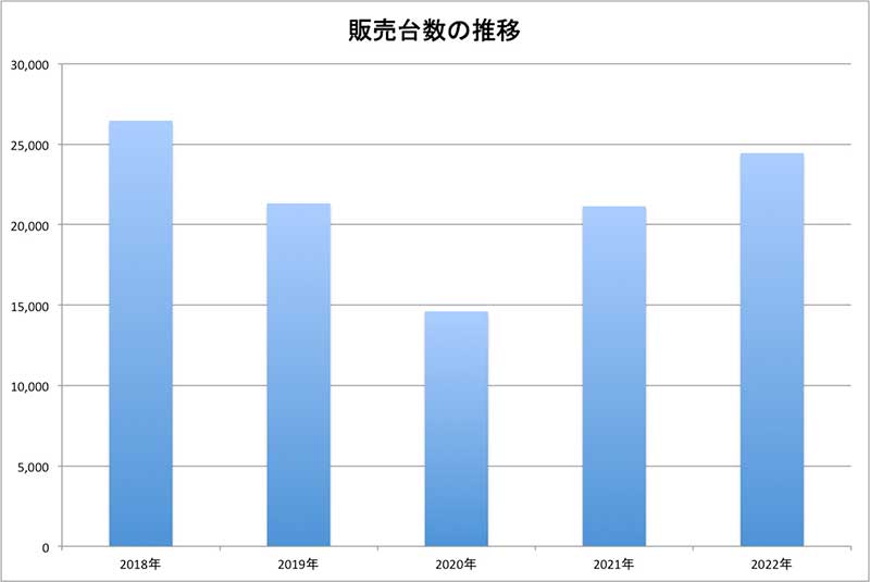 過去5年間のEV販売台数の推移を示したグラフ(日本自動車販売協会連合会発表の「燃料別販売台数(乗用車)」を基に作成)。2022年は10月までのデータになるが、半導体不足が叫ばれる中でコロナ前の2018年に迫るまでに販売台数が回復している