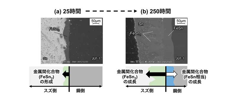 また、500℃の液体金属スズに10日間浸漬させたところ、約155マイクロメートル(1メートルの100万分の1)ほどの厚さの金属間化合物を形成して腐食し、同時に液体金属スズが鋼の微細組織に内方拡散して腐食が進行することも確認された。