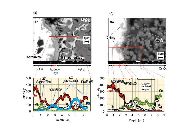 また、クロムの酸化物の焼結材でも表面のスズとの反応組織が非常に薄いことから、スズと反応しやすい鉄のような金属元素でもあらかじめ酸化物にすれば腐食反応を大きく抑制できることが初めて明らかになった。