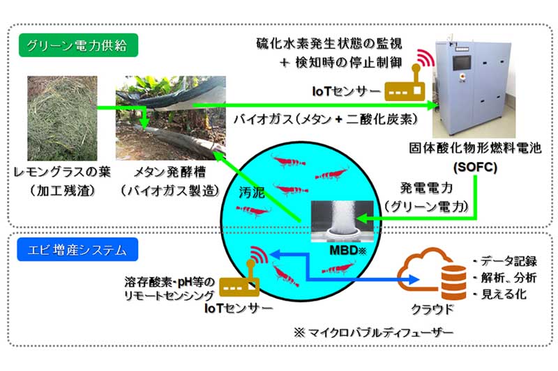 実証研究で使用されるエビ養殖システムは、バイオガスSOFCによる再生可能エネルギー由来のグリーン電力供給と、IoT水管理によるエビ増産システムが統合された循環型システムだ。