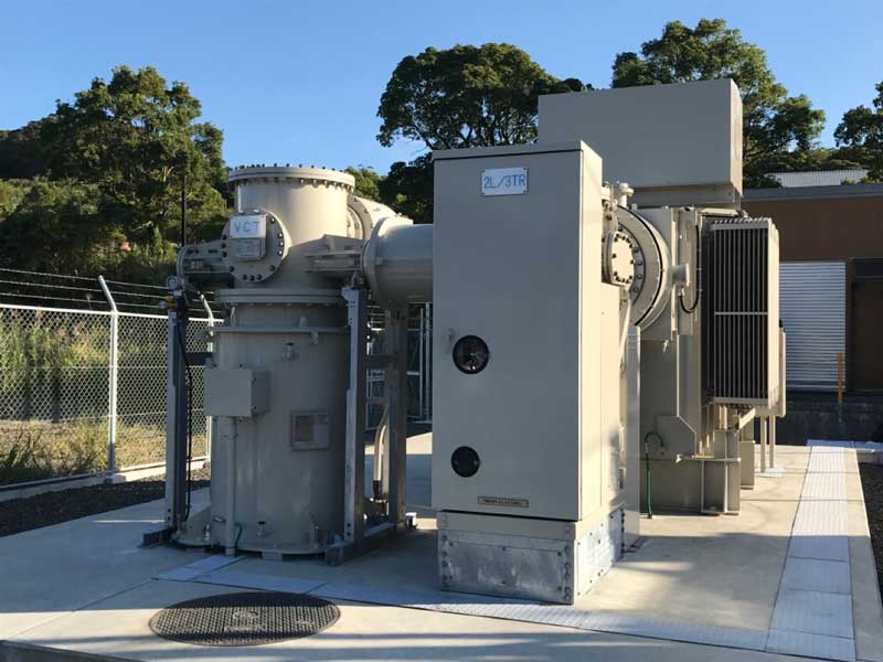 系統連系用特高変電所のGIS(ガス絶縁開閉装置)と変圧器