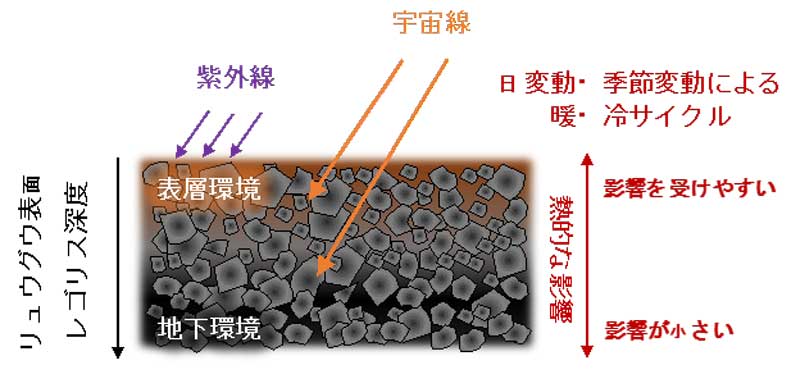 ウラシルとビタミンB3は、2種類の試料のうち地表下サンプルでより濃度が高いことから、リュウグウの最表層での宇宙線や真空紫外光による分解の影響が強く示唆される。このように小惑星上での有機分子の空間分布と要因が議論された例はなく、今回の研究は従来の隕石分析では成し得なかった成果をあげた。