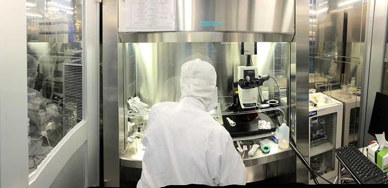 クリーンルームで超高分解能質量分析法による精密解析を行う様子。極微量試料分析用に最適化した多段的溶媒を抽出する