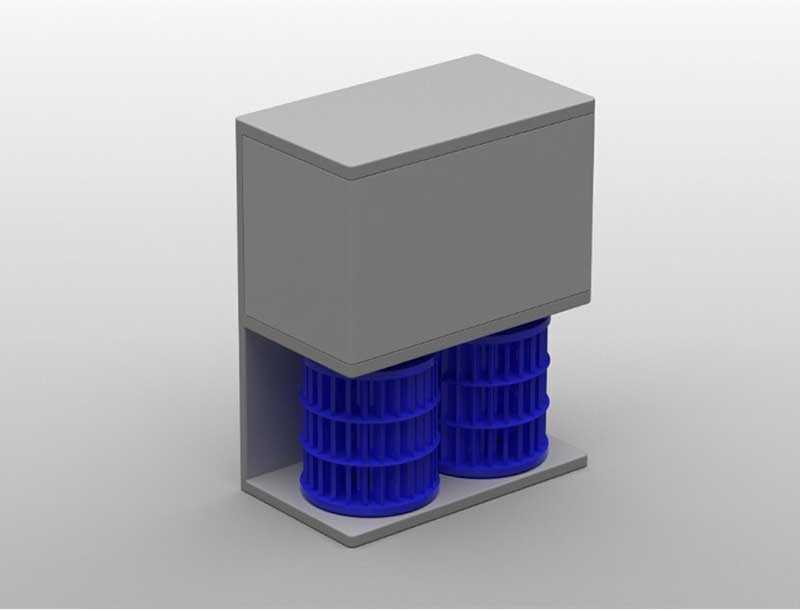 今回作製したマイクロ水力発電装置(イメージ)。青い筒状の2つの水車にバイオマス由来材料製の特殊な水車羽根が用いられた