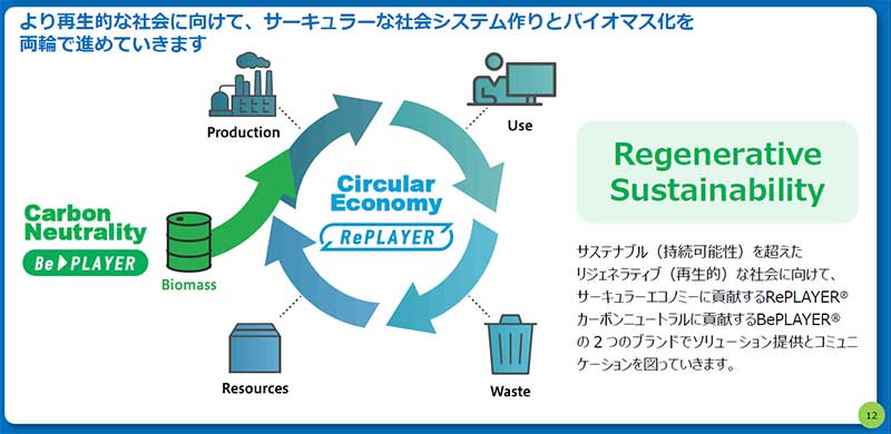 その使命を果たすために“改プラ”という発想に立ち、石油由来の素材をバイオマス(生物由来の有機資源)素材へ見直しカーボンニュートラルに貢献するBePLAYER(R)、廃棄物を資源と捉えて再利用しサーキュラーエコノミー実現を目指すRePLAYER(R)という2つのブランドを展開している。