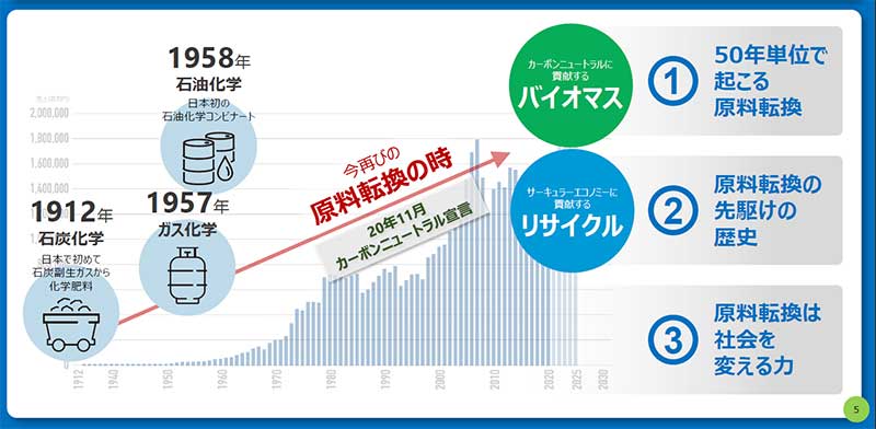 三井化学の歴史を見ると石炭、石油と50年単位で原料転換を進めてきている。それぞれコークス製造時の副生ガスやガソリンの副産物であるナフサの活用を見いだしてきた。「これからはバイオマスや廃棄物を原料とした新たな原料転換の時代に入っていく」と松永氏