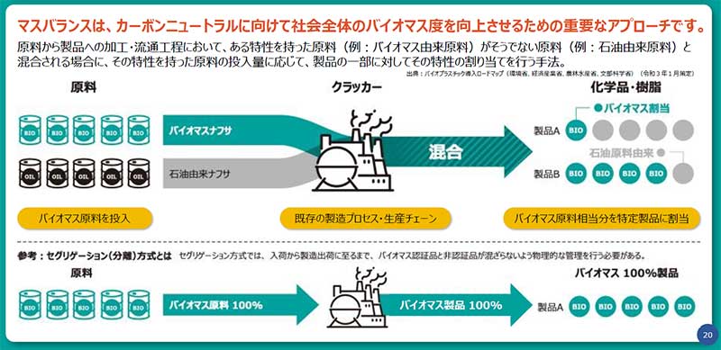 現在、世界中で流通するバイオマスナフサは30万t程度(2020年近傍)と言われていますが、日本の石油ナフサの年間使用量は約2000万tに上ります。バイオディーゼルやSAFの需要は世界的に伸びていますので、必然的にバイオマスナフサの供給量も増えてくることが期待されますが、すべてをバイオマスナフサにすることは難しいでしょう。そのため、弊社ではバイオマスナフサと石油ナフサを混合してクラッカーに投入し、 “マスバランス”という方式でバイオマスの見なし割り当てを行ったバイオマスプラスチックの販売を開始しています」