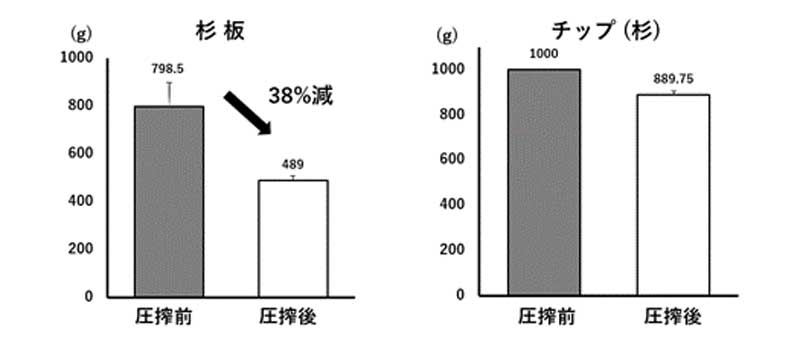 木材の圧搾前後の重量比較。チップ状の木材よりも、加工前の板材での圧搾がより効果的であることが分かる